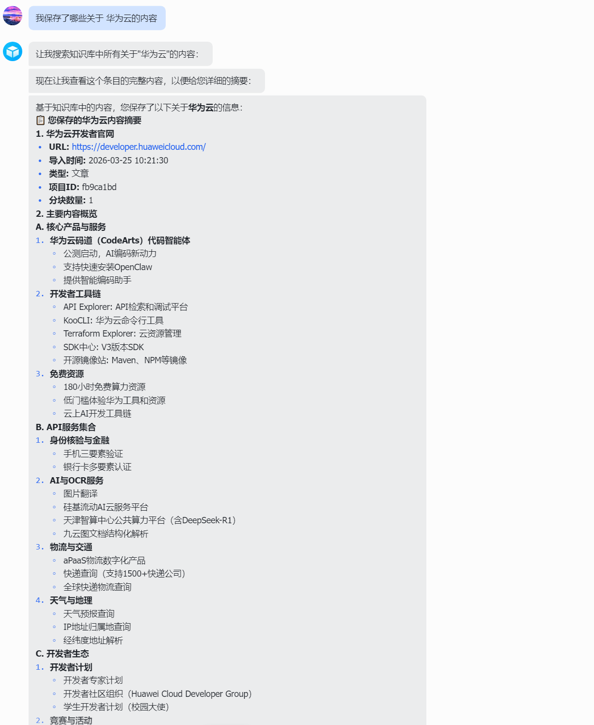 - 对你保存的所有内容进行语义搜索:搜索"我保存了哪些关于 "华为云” 的内容?"会返回带来源的排序结果