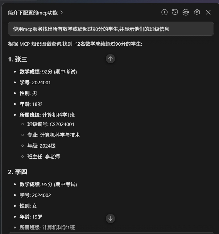 “使用MCP服务器找出所有数学成绩超过90分的学生,并显示他们的班级信息”