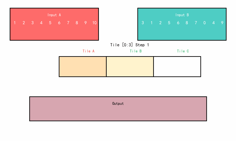 - Tiling实现: 大多数情况下,Local Memory的存储,无法完整的容纳算子的输入与输出,需要每次搬运一部分输入进行计算然后搬出,再搬运下一部分输入进行计算,直到得到完整的最终结果,这个数据切分、分块计算的过程称之为Tiling。根据算子的shape等信息来确定数据切分算法相关参数(比如每次搬运的块大小,以及总共循环多少次)的计算程序,称之为Tiling实现。可看下面示意图(设定场景:假设某 AI Core 的片上存储容量上限为 10 个数据元素):
