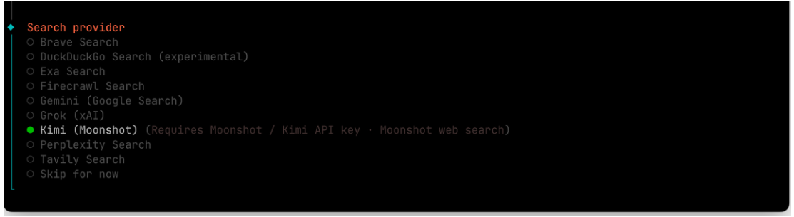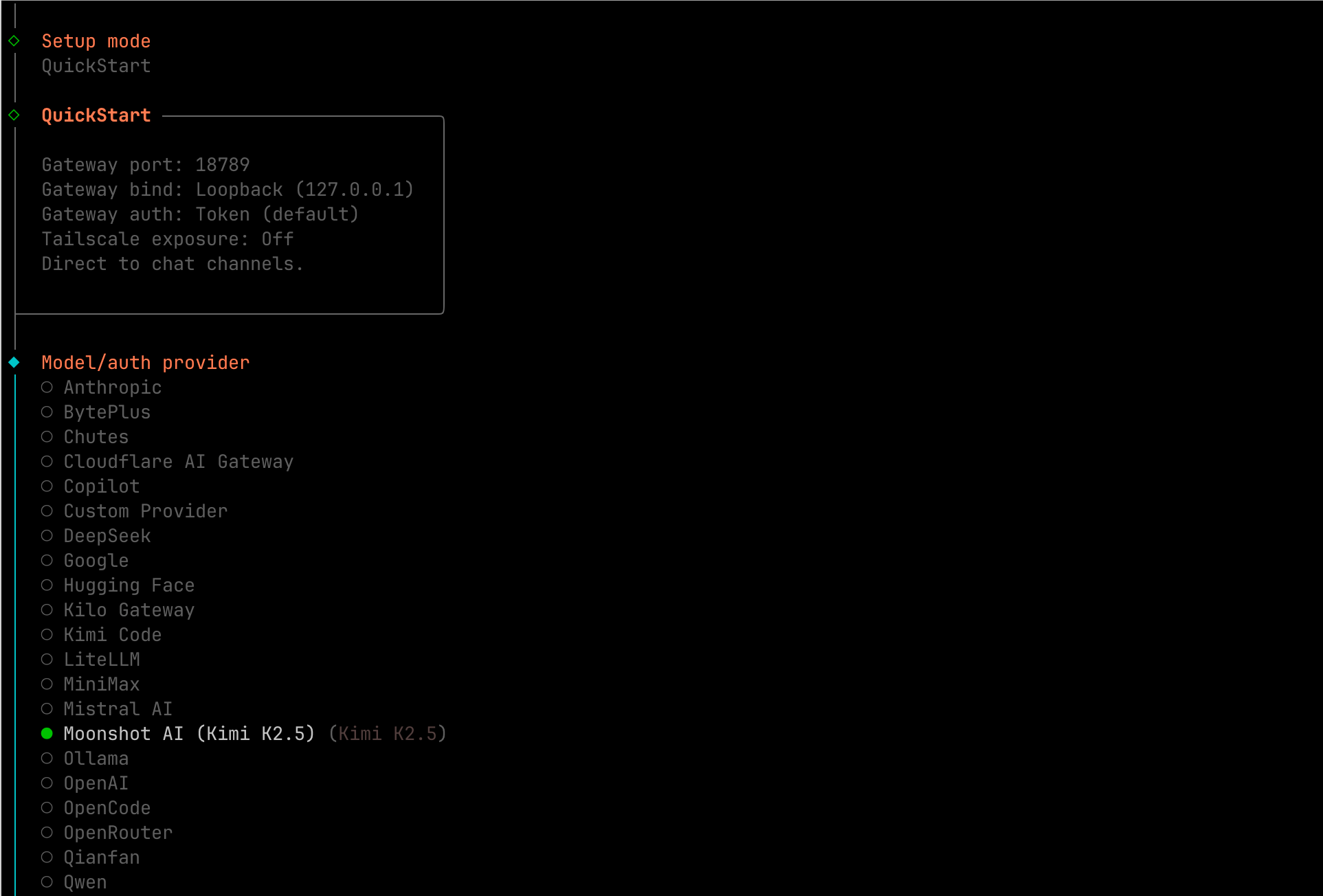 选择Model,这里我们选择OpenClaw创始人推荐的Moonshot AI(Kimi K2.5)进行作为基础模型。