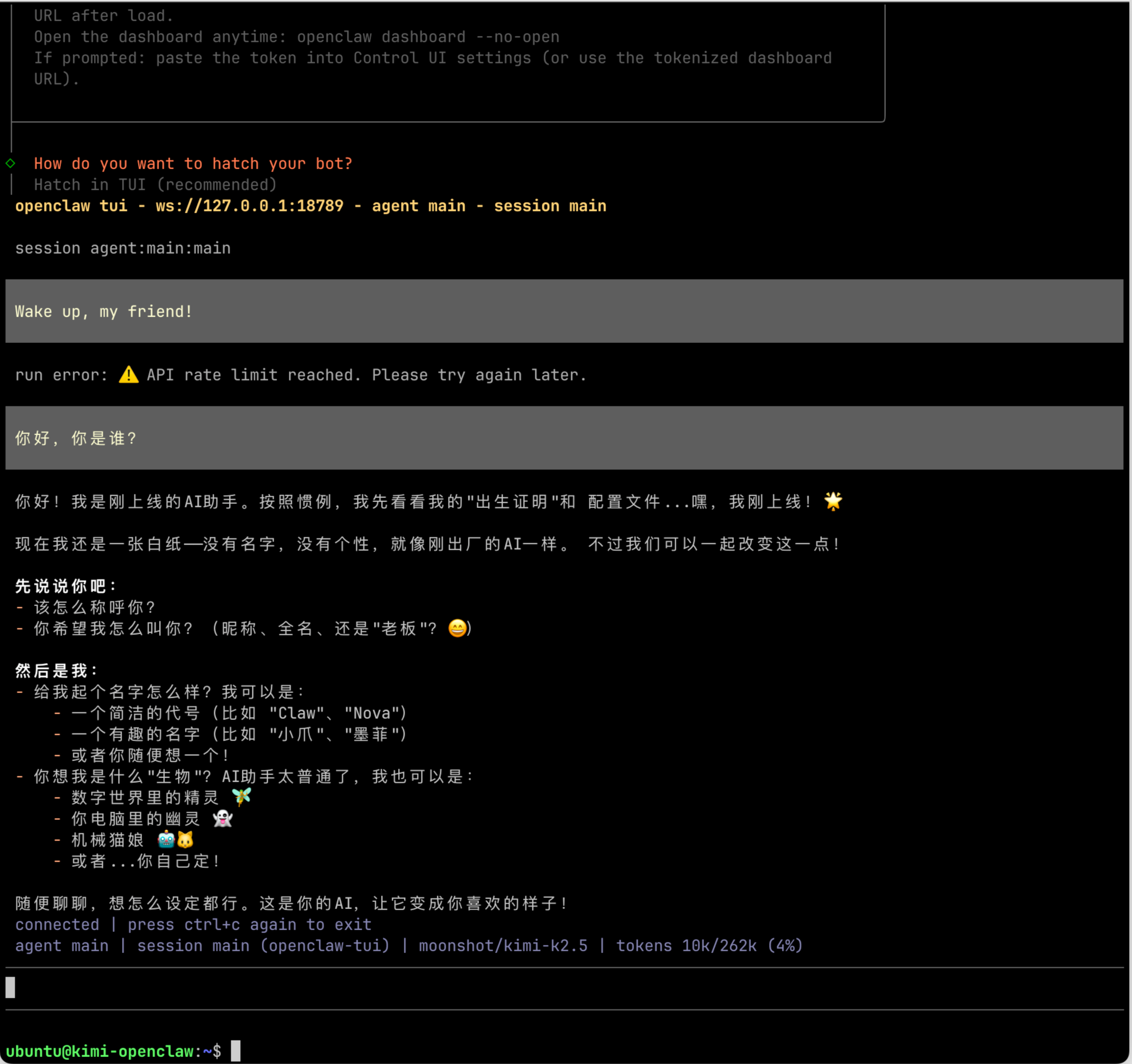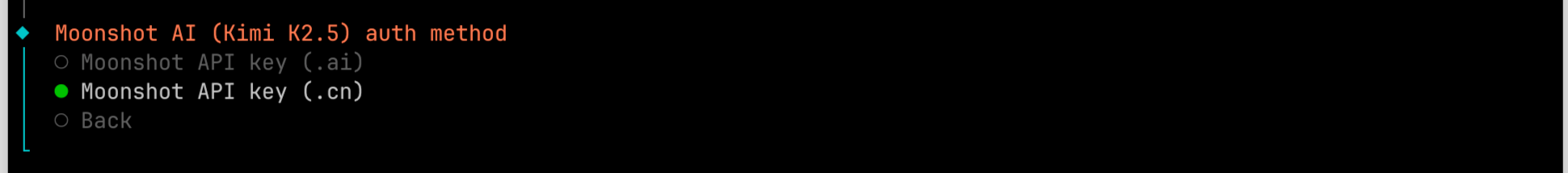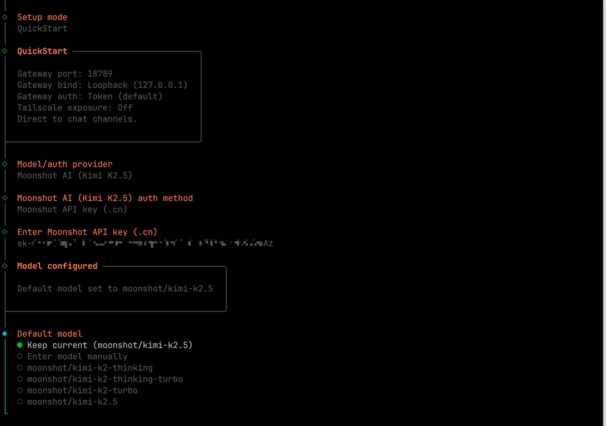 将复制的API Key贴入终端并敲击回车,然后选择Moonshot/Kimi-K2.5模型并敲击回车确认。