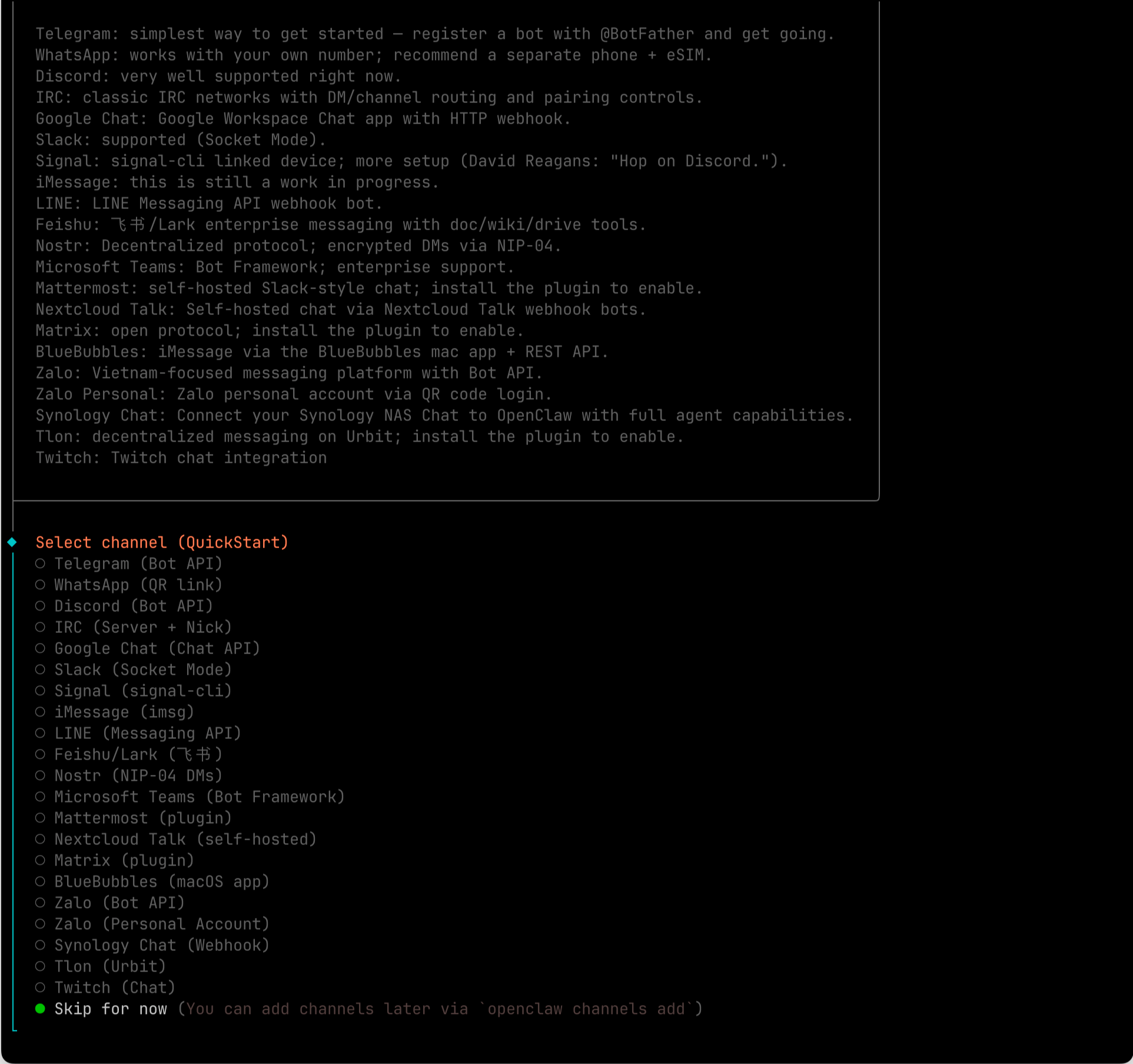 选择与OpenClaw聊天的载体,我们可以先跳过,使用tui进行体验。