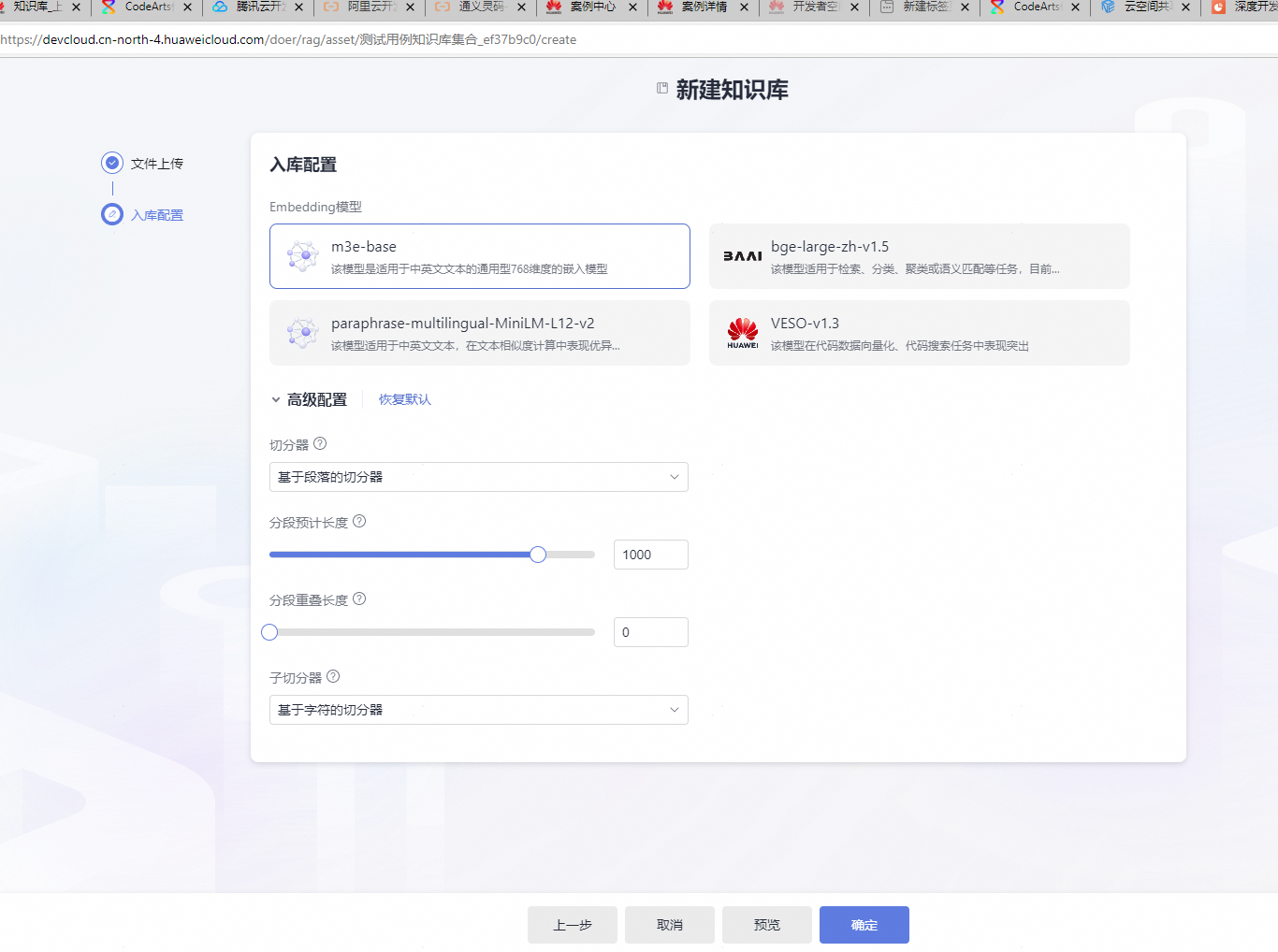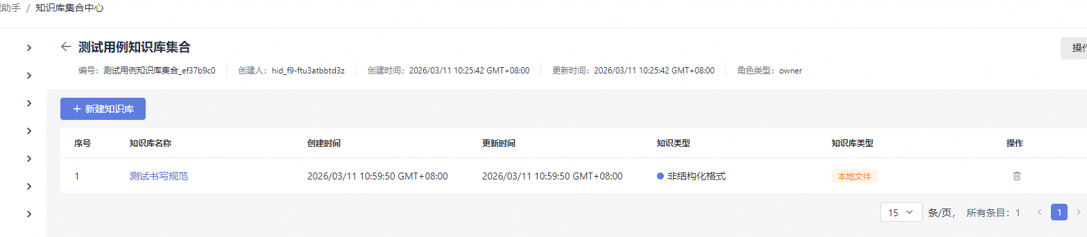 - 创建知识库并上传知识文件,对知识进行切片、向量化处理后入库存储。