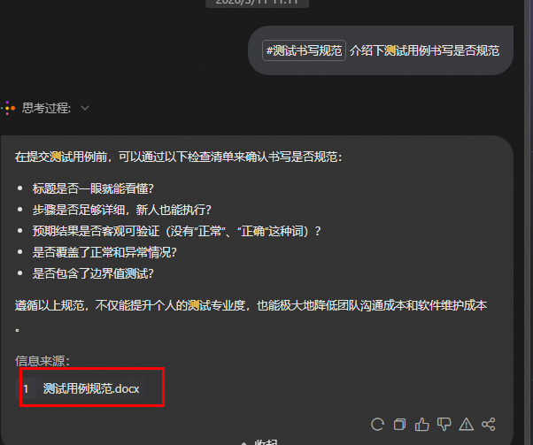 截图中可以看到,我们新建的知识库被使用了,输出结果会参考测试用例规范执行。