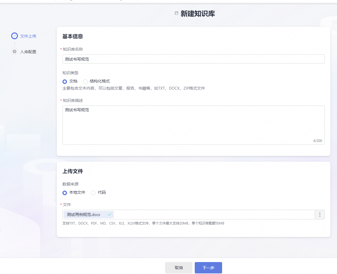 注意:单个文件最大支持20MB,单个知识库配额50MB