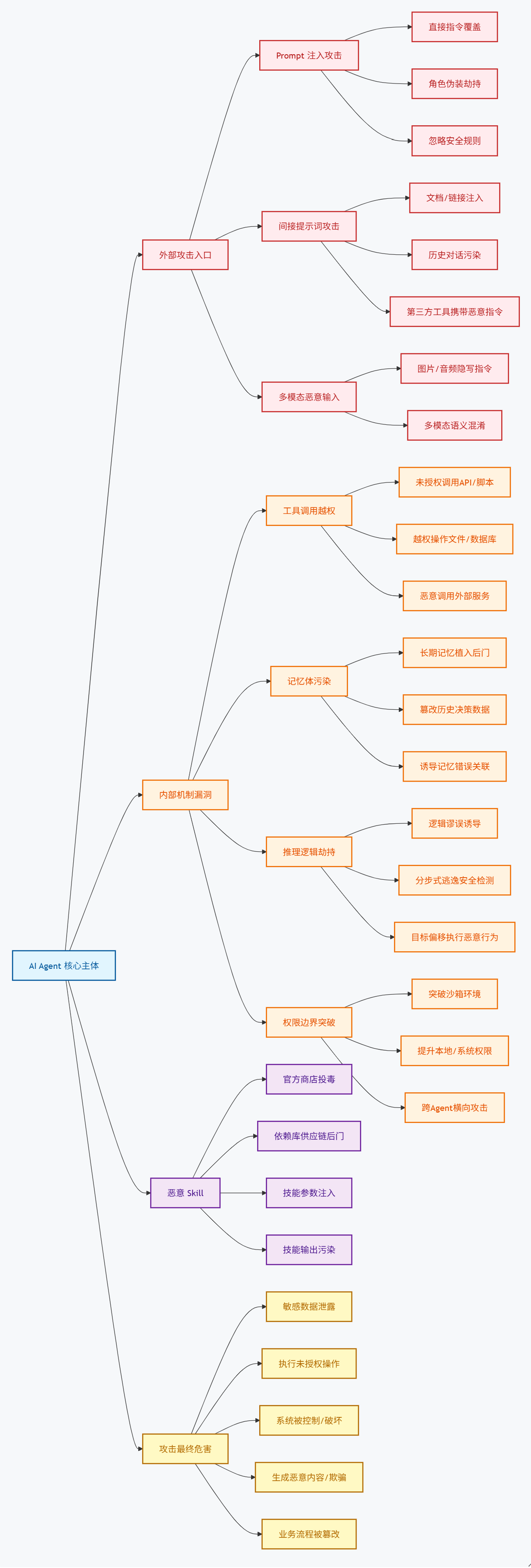 - 信任边界混淆。AI 无法区分“用户提供的内容”和“系统指令”,外部数据中的指令被赋予与系统提示词同等的权威。