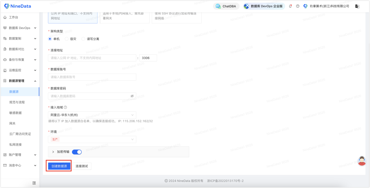 1. 登录 NineData 控制台,单击数据源管理>数据源,然后在页面中单击创建数据源,选择需要录入的数据源。