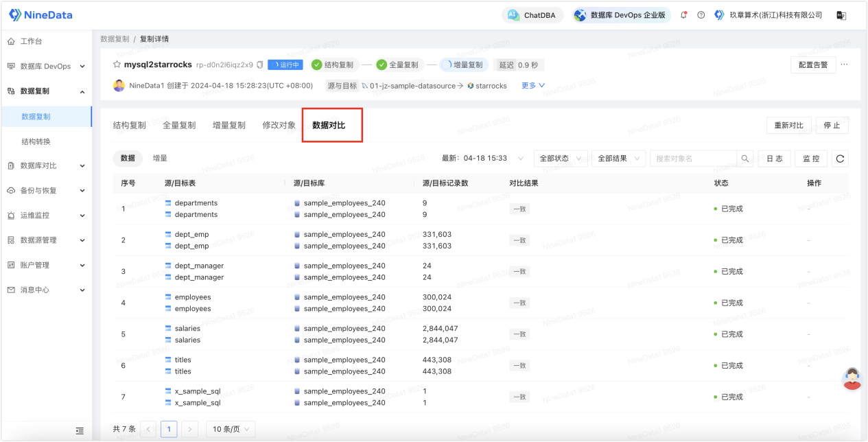 除了同步功能以外,NineData 还提供了同步后源端和目标端同步数据的对比功能,以确保目标端数据的一致性。
