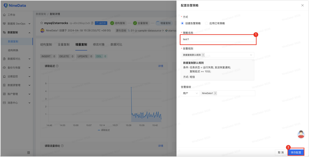 3. 输入策略名称,单击保存配置即可。您可以使用内置的默认规则,在任务运行失败,或复制延迟大于等于 10 分钟的时候,发送短信提醒。您也可以自定义创建规则,根据需求进行通知。