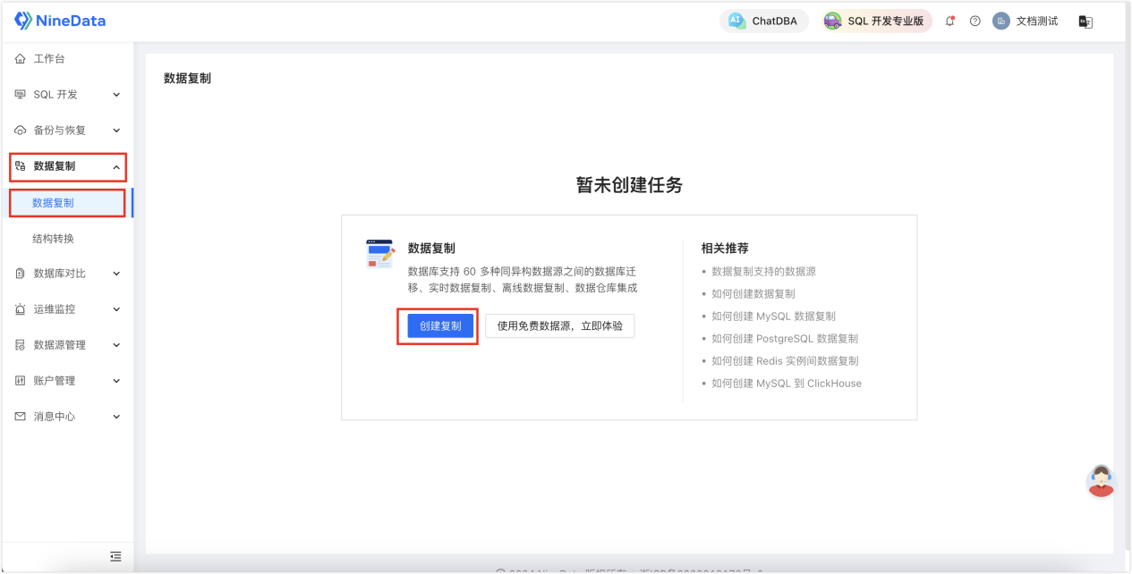 1. 登录 NineData 控制台,单击数据复制>数据复制,然后单击创建复制。