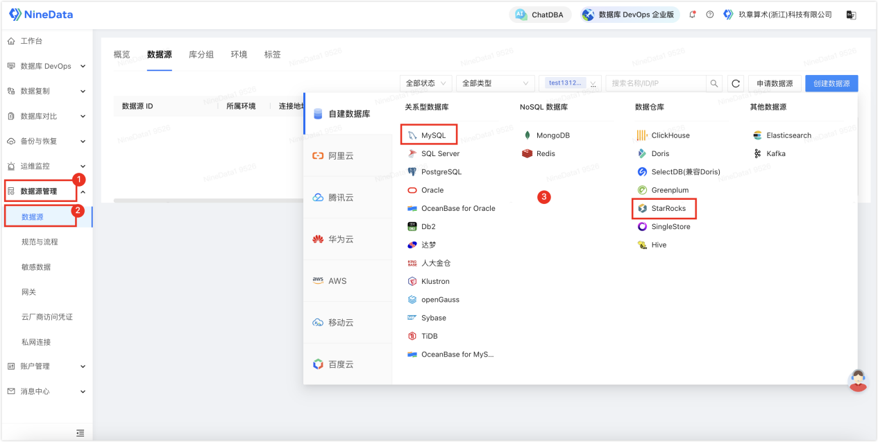 1. 登录 NineData 控制台,单击数据源管理>数据源,然后在页面中单击创建数据源,选择需要录入的数据源。