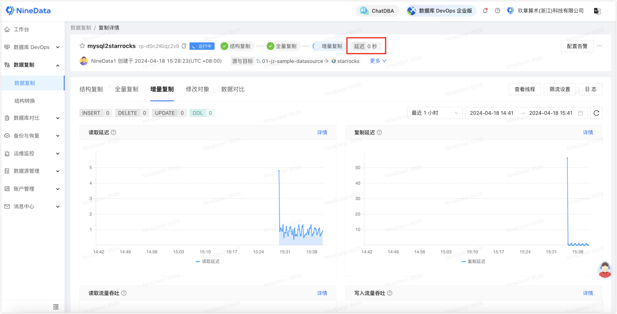 3. 配置完成后启动任务,针对您配置的同步对象,NineData 会先对相关存量数据进行全量迁移,接下来实时同步 MySQL 中新增的增量数据。每当目标端的增量数据基本追平源端时,任务面板中会显示延迟 0 秒,表示当前 StarRocks 中的数据已基本追平源端。