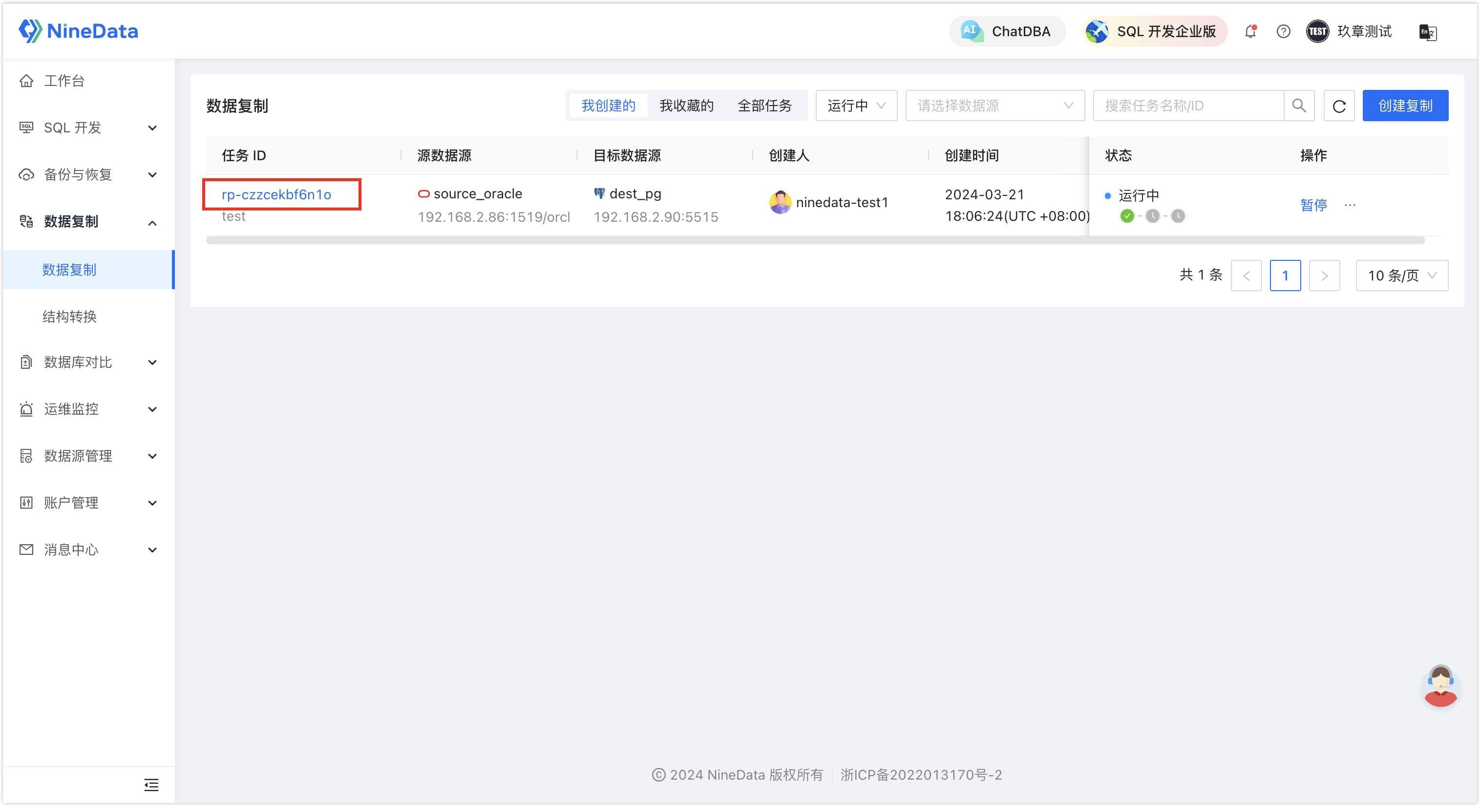 登录 NineData 控制台,单击数据复制>数据复制,然后单击步骤二中创建的复制任务 ID。
