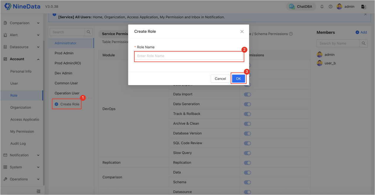 1. 登录 NineData 账户,单击账户管理 > 角色管理,然后单击新建角色,创建两个角色: