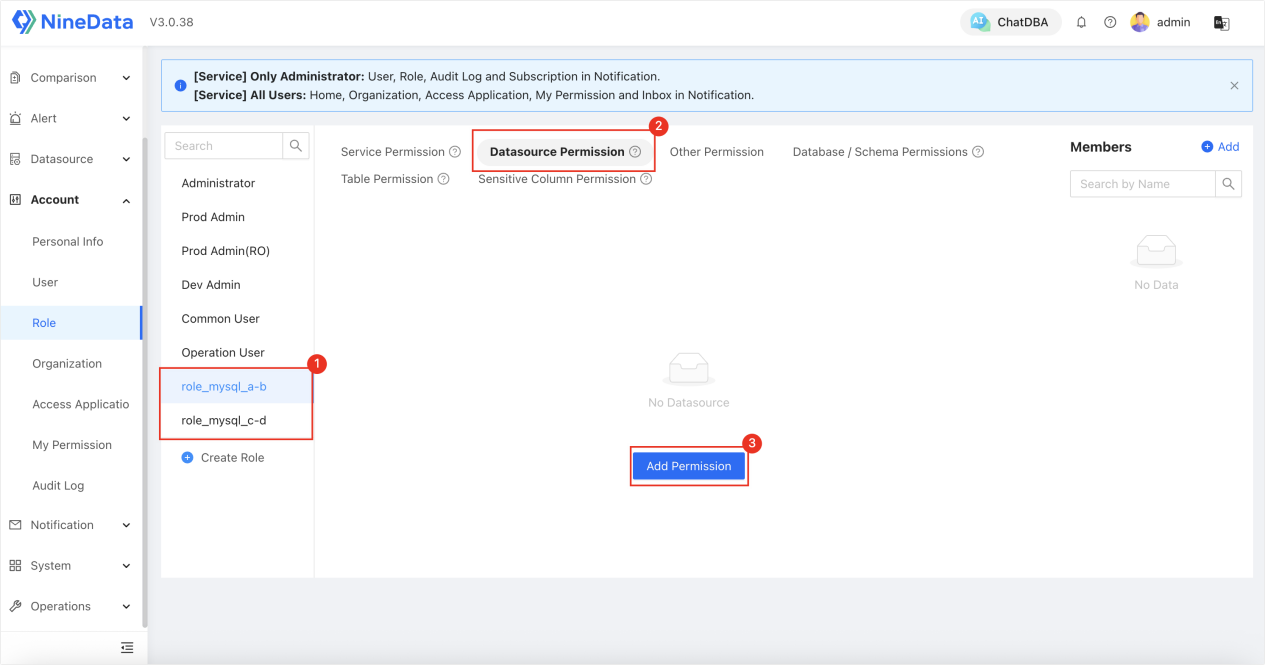 2. 单击目标角色,然后单击数据源权限页签,并单击添加数据源权限,分别为新建的两个角色添加不同数据源的权限: