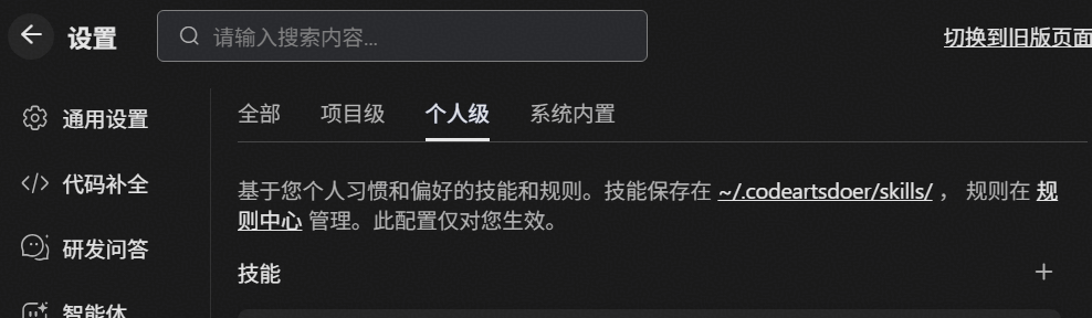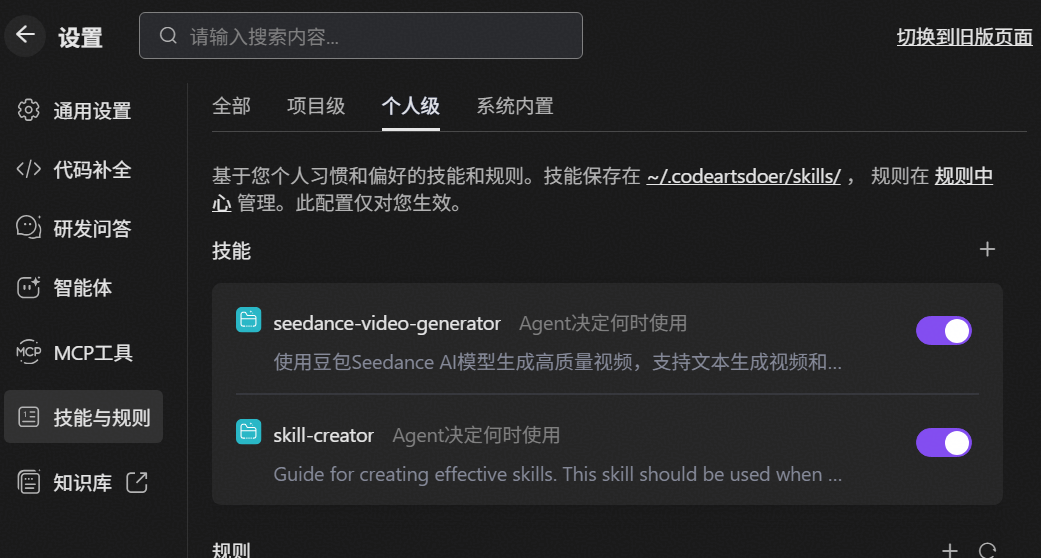 Step1:在码道 设置->技能与规则->系统内置 里检查一下是否有 skill-creator 这个技能。如果没有,把skill-creator压缩包(skill-creator.zip)解压后放到个人级skill目录里。拷贝进去后重新关闭打开码道,在设置->技能与规则->个人级,可以看到这个技能。它是skill兵工厂,可以生成其它任意skill。