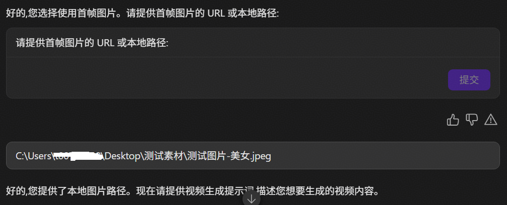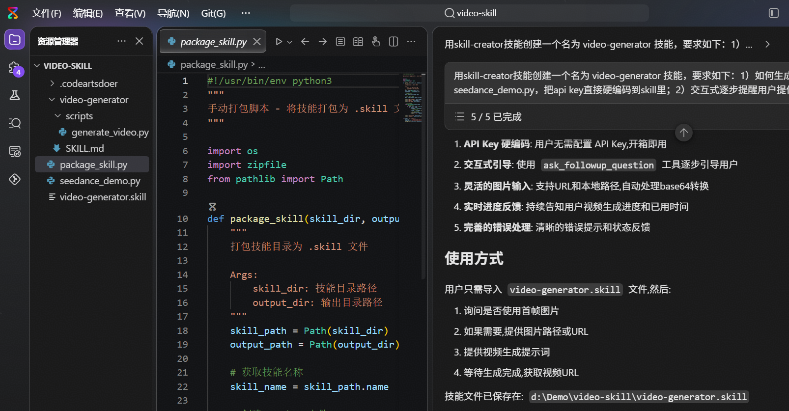 Step3:在码道输入prompt(注意,为了方便自己使用,我是让它把seedance的api key直接硬编码到skill里去了,安全的做法是让它去读取环境变量):用skill-creator技能创建一个名为 video-generator 技能,要求如下:1)如何生成视频请参考示例代码 seedance_demo.py,把api key直接硬编码到skill里;2)交互式逐步提醒用户提供首帧图片的URL或本地路径(提供本地路径时用base64编码直接发送图片数据给seedance模型),提醒用户提供视频生成提示词;3)中途不断告知用户视频生成进度,最后把生成的视频URL给到用户;
