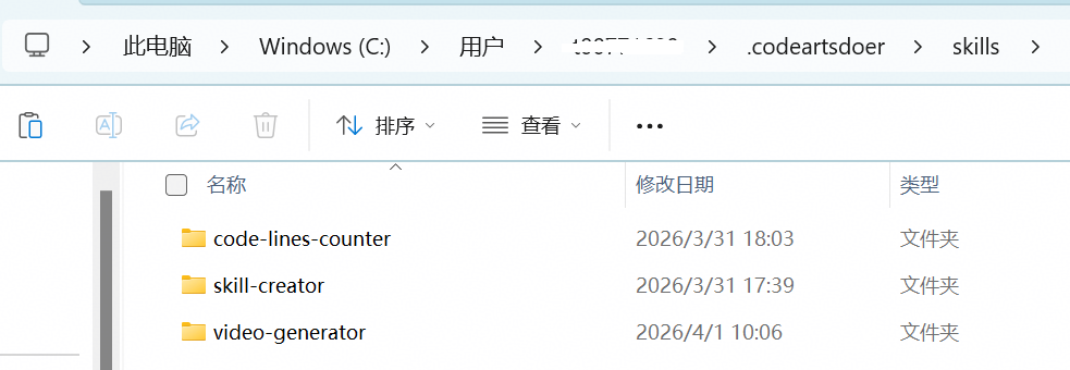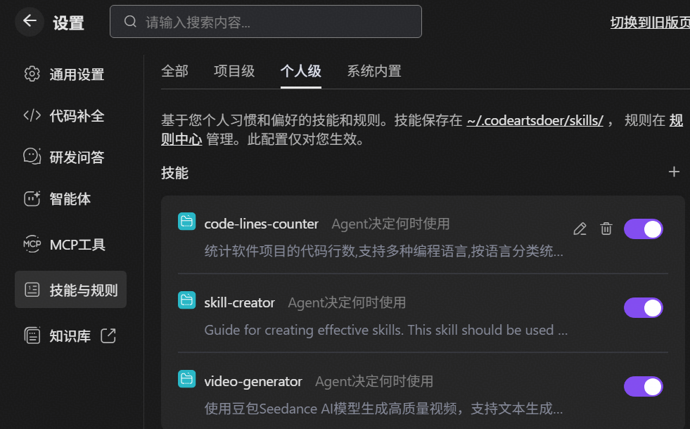 Step4:把生成的 video-generator 目录拷贝到码道个人级skill目录里去(码道->设置->技能与规则->个人级,点击打开 ~/.codeartsdoer/skills/目录),关闭再重新打开码道设置窗口,可以看到在个人级技能下多了一个video-generator技能