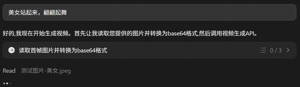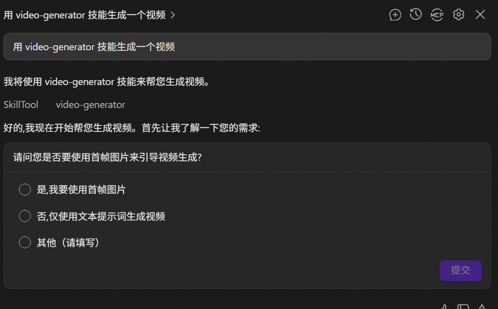 Step5:在任意项目开发闲暇时,可以输入prompt:用 video-generator 技能生成一个视频。 按skill的提示,提供图片和提示词,