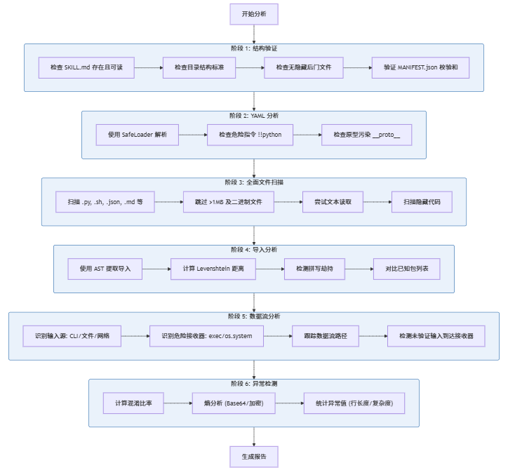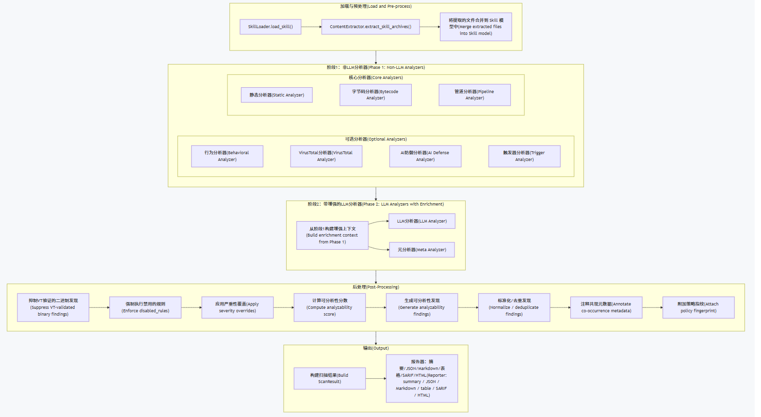 流程图详细描绘了 Skill 扫描器(Skill Scanner) 的核心工作流程。流程展示了一个从数据加载、多阶段分析(结合传统静态分析与 LLM 大模型分析)、后处理到最终报告生成的完整自动化流水线。