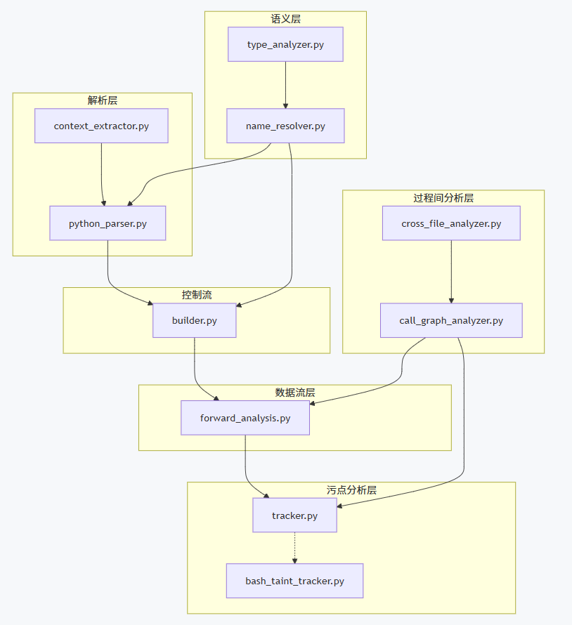 源代码 → 解析器 → 控制流图 → 数据流分析 → 污点追踪