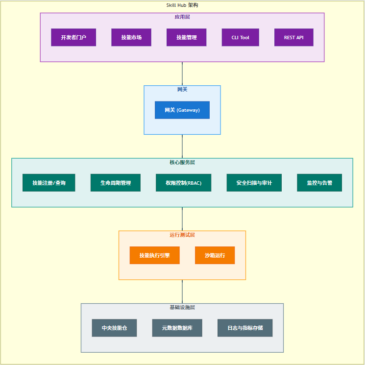 Skill Hub 系统采用了典型的分层架构设计。以下是各个层级的主要功能描述: