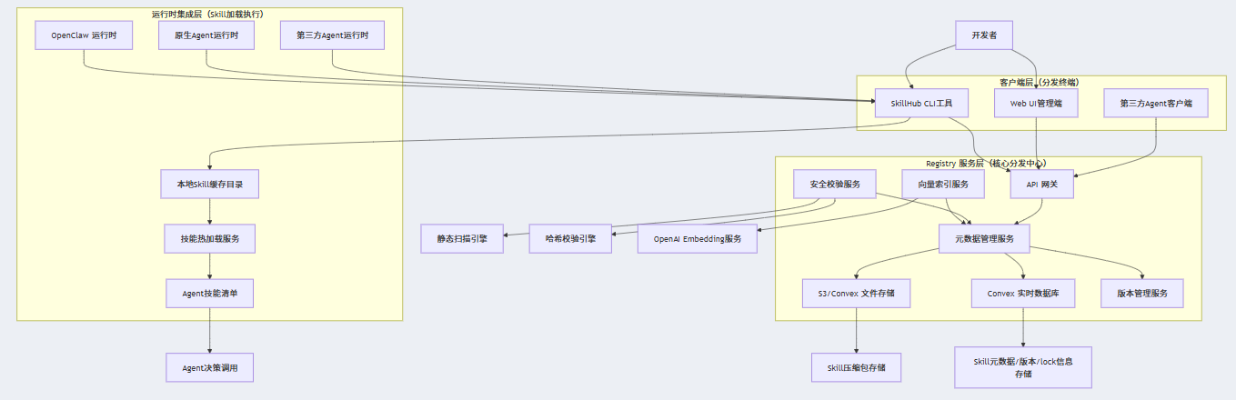 | Registry 服务 | 技能元数据管理、版本控制、文件存储、API提供 | ClawHub Registry | 新增多模态技能元数据支持、跨框架兼容标记 |