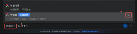 在CodeArts代码智能体对话框下侧点Agent模式,在弹出的菜单最后侧点设置按钮。