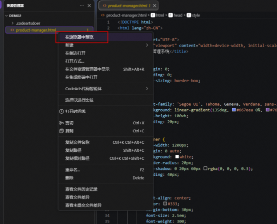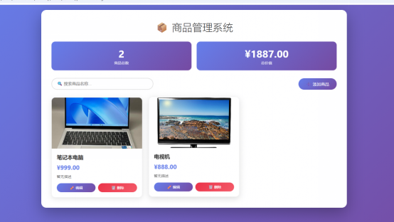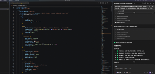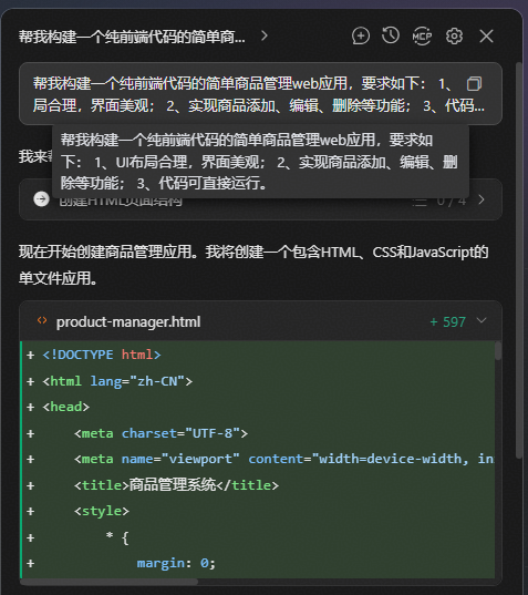 在CodeArts代码智能体对话框中输入“帮我构建一个纯前端代码的简单商品管理web应用,要求如下: 1、UI布局合理,界面美观; 2、实现商品添加、编辑、删除等功能; 3、代码可直接运行。”使智能体自动构建此应用,并运行程序: