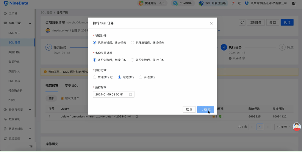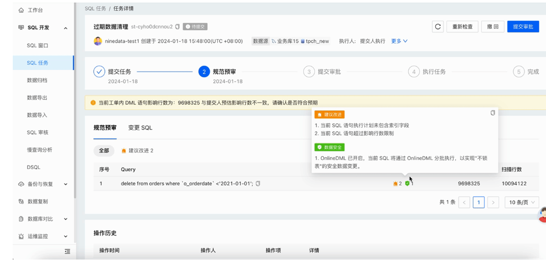 因为生产环境不只关心“能执行”,还关心审批、规范、风险识别、节奏控制、留痕和复盘。脚本通常只能解决执行本身,而平台方式更容易把这些动作放进同一条链路里。NineData 的意义,也正是在这里体现出来:它不只是提供执行入口,还让整次大批量清理更便于控制。