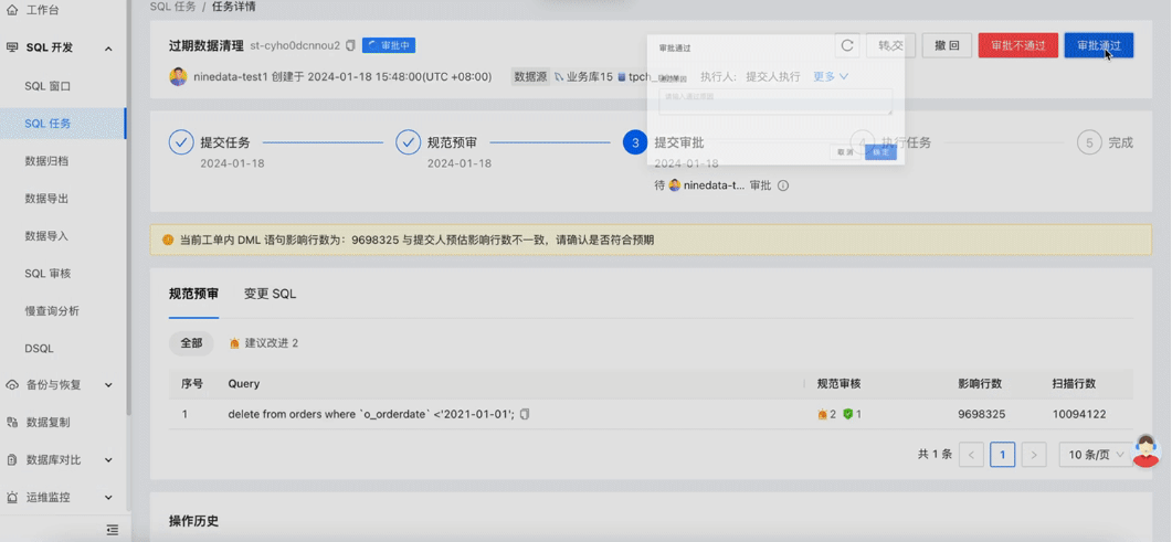 NineData 在这个场景中的意义,更适合被理解为:把大批量 DML 的风险识别、拆批执行和流程沉淀放到同一条平台链路中处理。