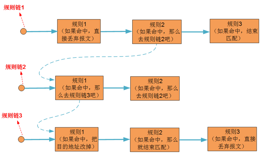 用户可以在一张表中任意增加规则链,规则链上面的某个规则如果命中,那么可以要求命中的报文进入到另外的规则链中继续处理。基本长这个样子: