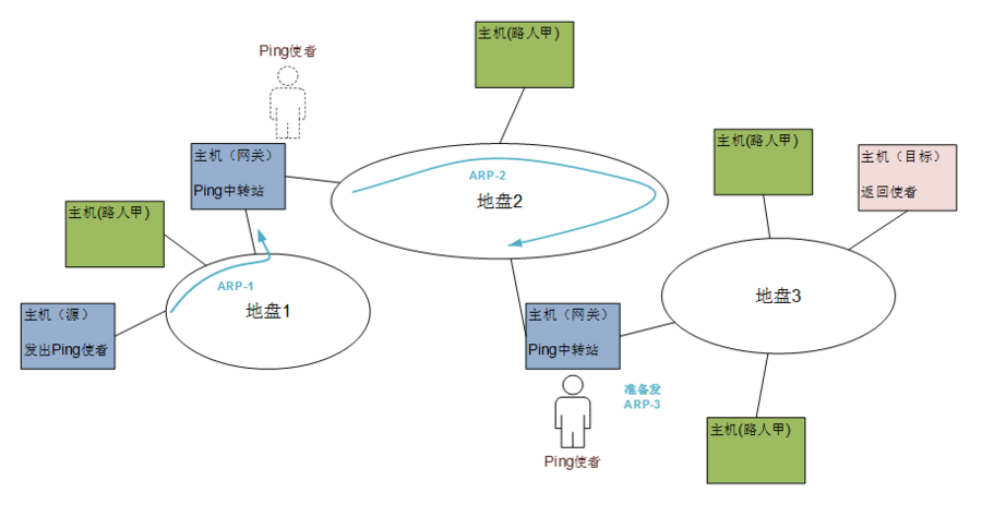 当Ping报文拥有了ARP这个探路神器后,想要到达最终的目的地就相当的easy了。当他处于一个站点,面对一个新的地盘的时候,先吼一声ARP大招,就知道一下站出口在哪里了。然后直接跳到下一站,接着再吼一声ARP找出下一站位置,继续跳到下一站。这样重复N次就到达了最终目的地。