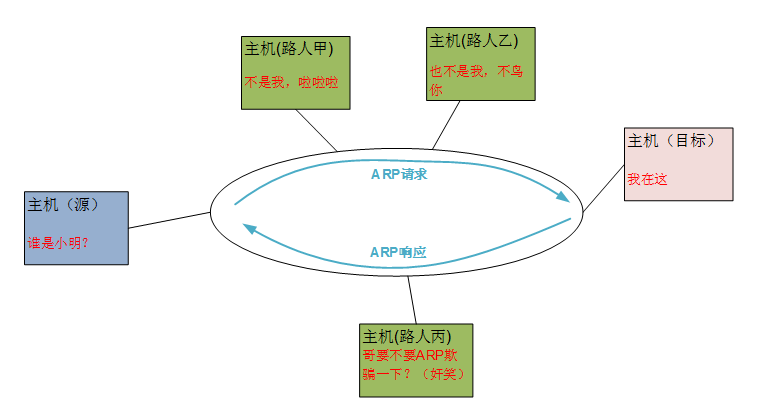 其次,ARP神器基本靠一招走遍天下,发动攻击前吼一句:“谁是小明,请吱一声”,然后声波传遍当前子网各个角落。其中真实的小明乖乖回答:“我在这”。