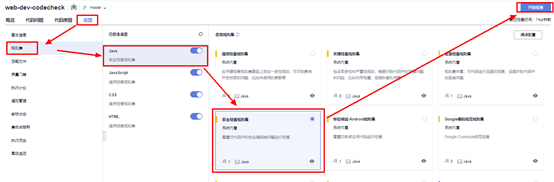 进入代码检查任务的“设置”界面,选择“规则集”在Java语言的“启用规则集”中选择“安全检查规则集”