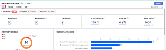 点击项目“demo”项目顶部菜单栏“代码”,然后选择“代码检查”进入代码检查界面,选择“web-dev-codecheck”检查任务,进入