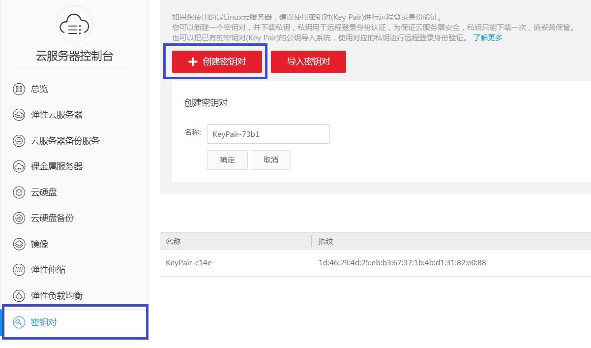 1) 创建密钥对:进入云服务器控制台的密钥对界面,创建一条密钥KeyPair-73b1,同时系统自动给你推送私钥(私钥需要保存好,不能丢失,否则主机就无法登录)。