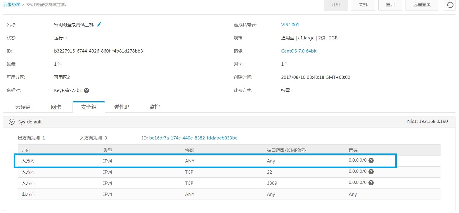 2)检查云主机的安全组,这里采用了默认安全组,实际使用时,应该将安全组的权限控制最小化。