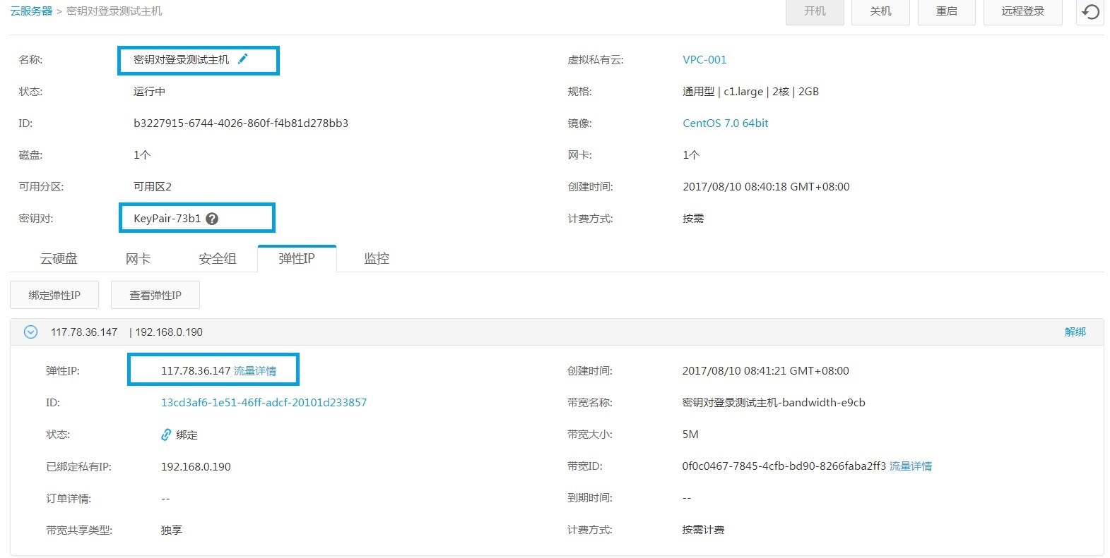 4) 检测创建好的弹性云主机的配置,如弹性IP地址、密钥对和安全组设置等。