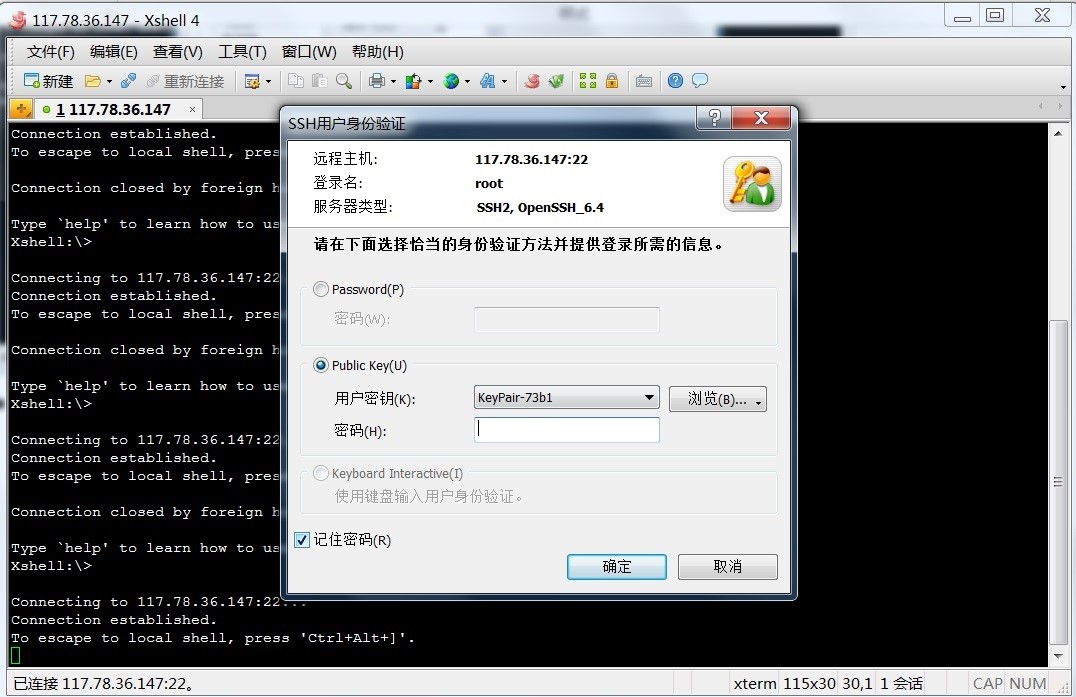 3) 配置密钥,并还可以在Xshell中加入密码设置,防止你电脑上Xshell中的这个登录链接被人利用,并勾上记住密码,这里密码可为空。