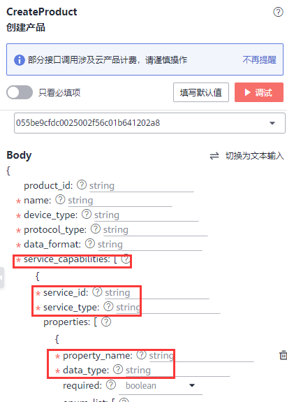2、API的CreateProduct接口要求的参数如下: