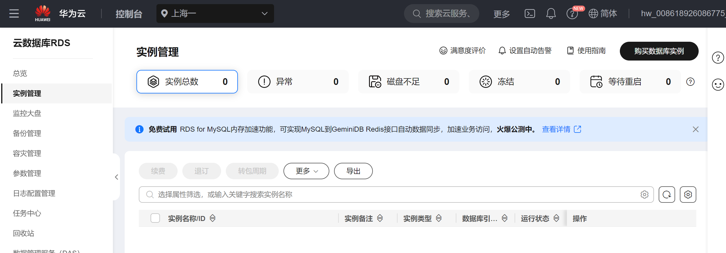 客服第1次指导我使用的时候是正常的,但后面我自己用的时候,在控制台能够看到有1个数据库实例,点击该实例进入到实例详情页后,实例不见了,实例总数也是0,我区域选择的是上海一