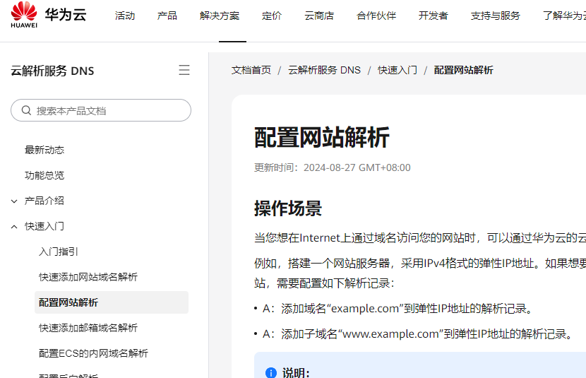 在【Flexus云服务】中,在域名选项卡中,提示可以添加域名,但操作指南点开后为【云解析服务 DNS】的操作指南。