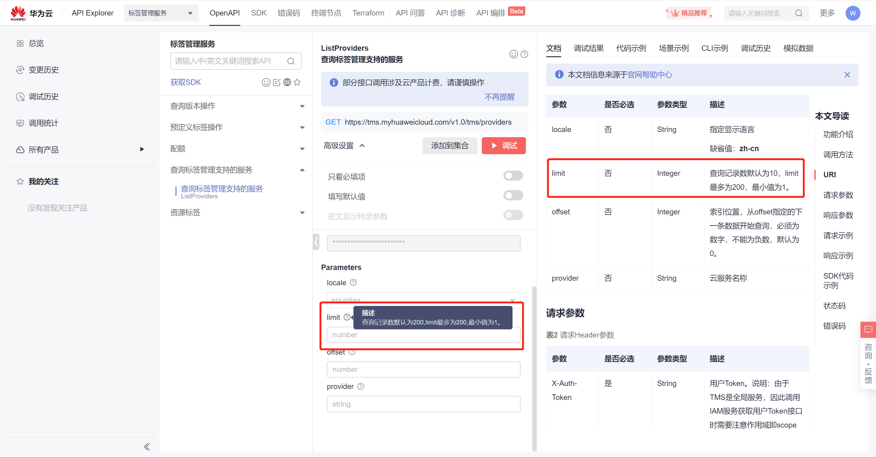 【用户体验】API Explorer TMS的ListProviders接口limit参数的提示文本描述错误,默认值不是200,是10 已实现 编辑 删除