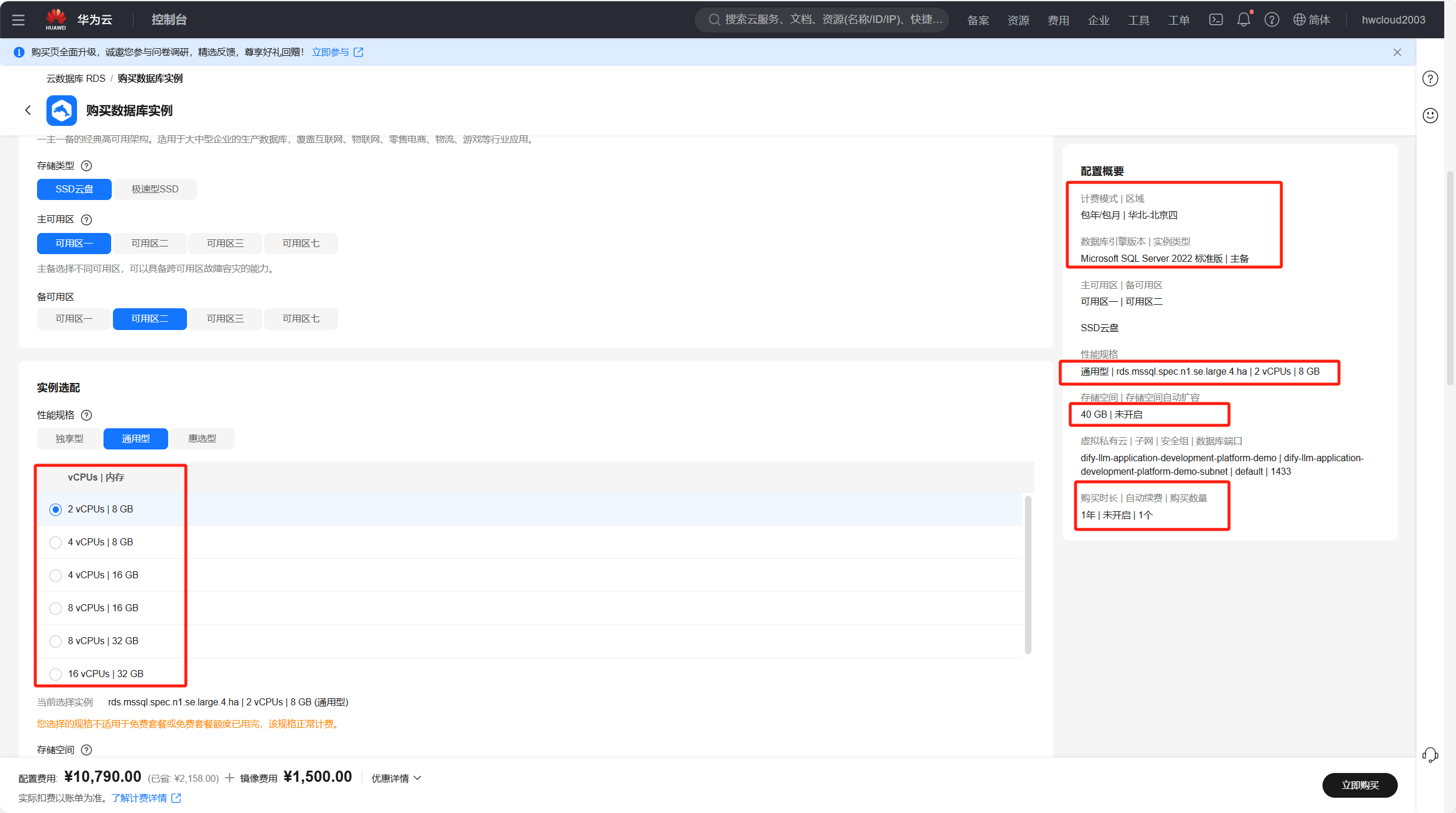 华为云官网计算器Microsoft SQL Server 2022 标准版 | 主备 | 通用型 可见规格如下图: