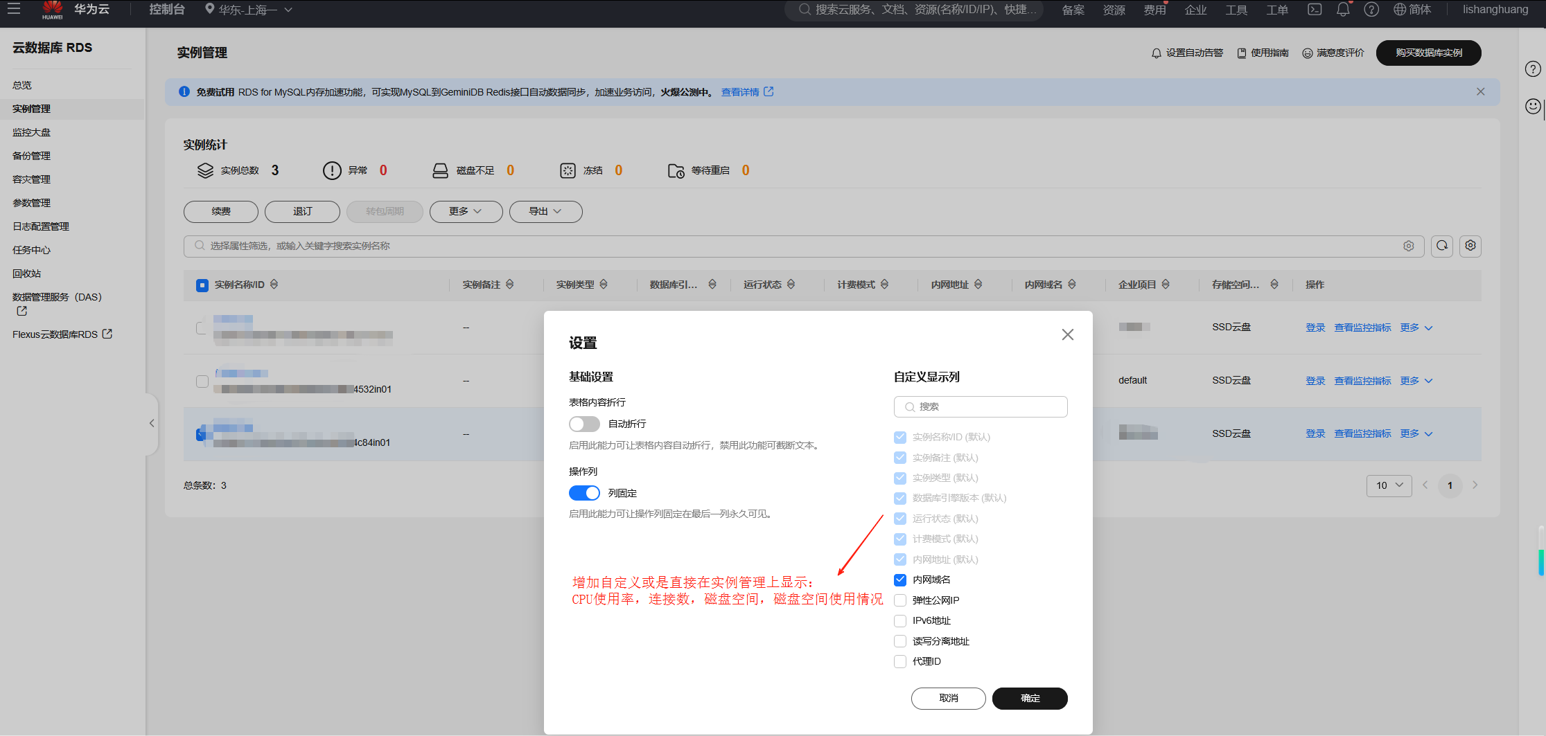 建议方案:建设增加RDS的CPU使用情况,连接数,磁盘容量,磁盘容量使用大小,做为自定义显示列之类
