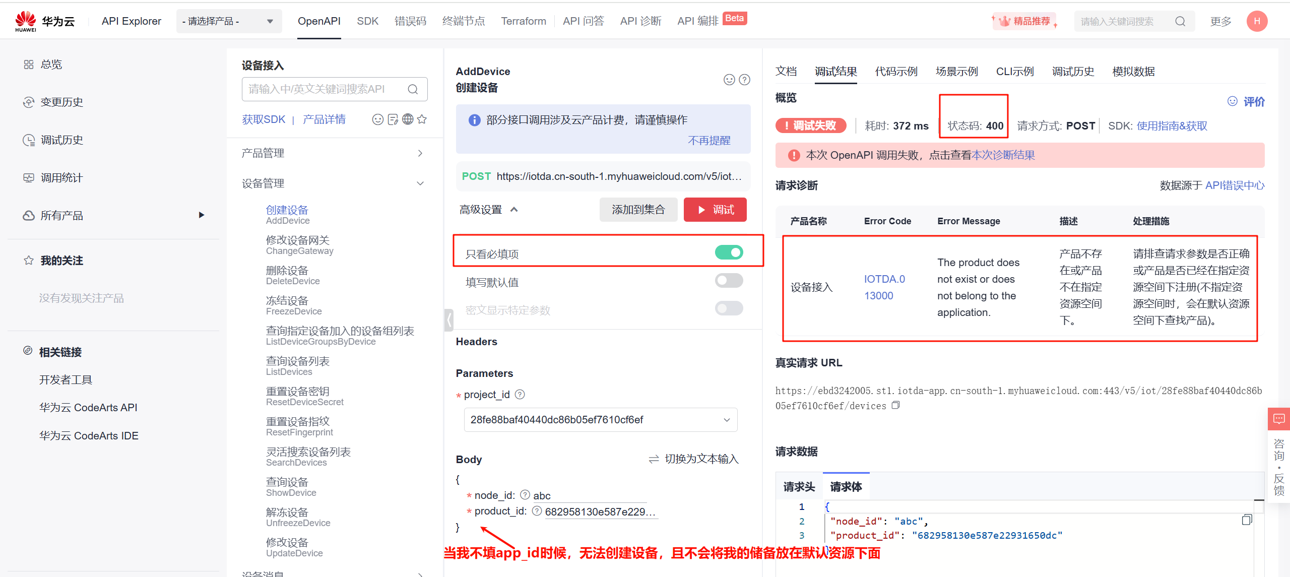 当我只填入必要的必填参数时,会报错,只有当我加上app_id才能正常注册设备到对应的产品中