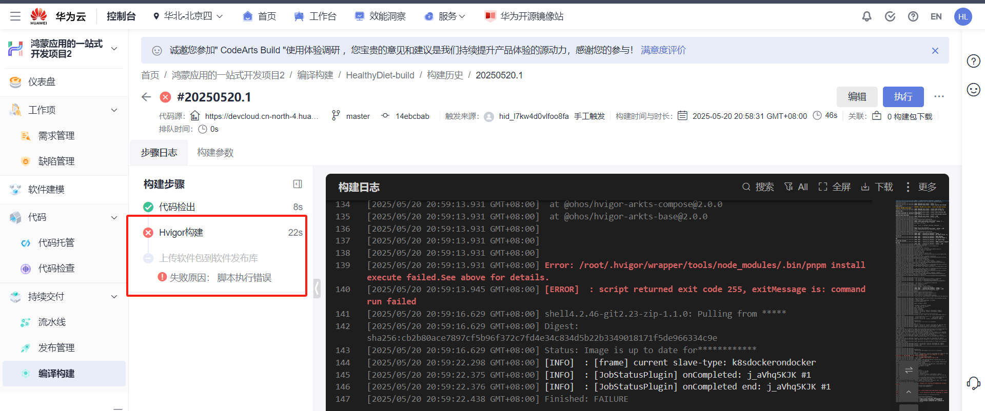 【功能建议】【CodeArts鸿蒙体验】编译构建提示脚本执行错误,无法完成编译构建。 已实现 编辑 删除