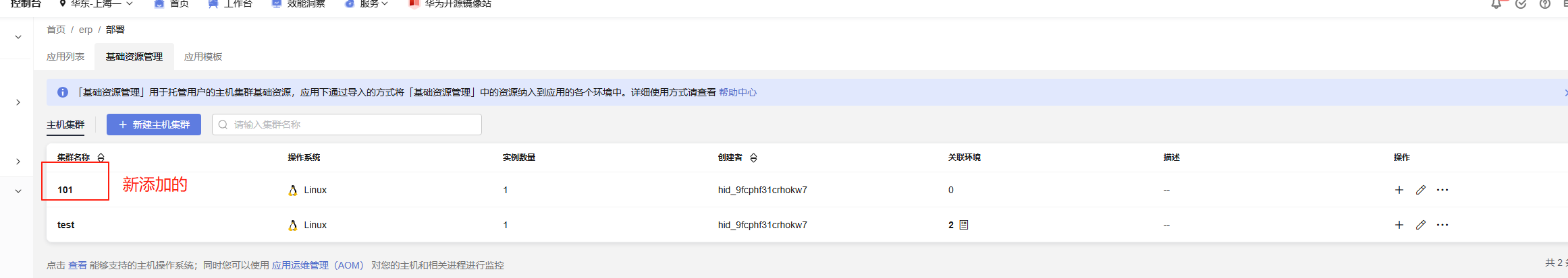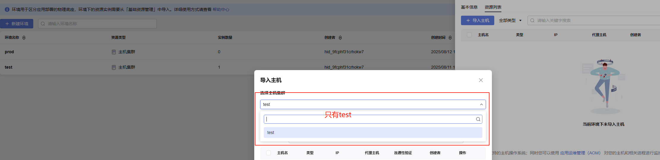 【产品缺陷】devCloud中部署中添加了一个新的主机集群基础资源,但是部署的时候环境管理中并没有这个新添加的主机集群资源可选 已实现 编辑 删除