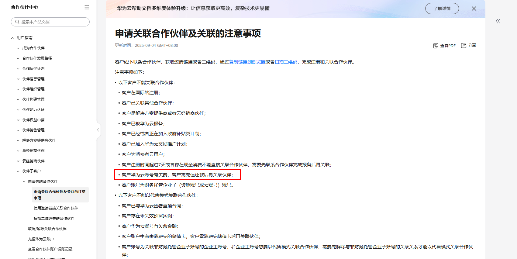 - 客户华为云账号有欠费或未结清账单,客户需充值还款后再关联伙伴;